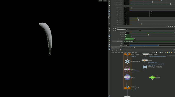Then, I assigned a petal ID to each point to manage later instances, and used a line setup and copy to each point to generate the base curves for each petal. These lines serve as growth paths, giving the direction of the petals before shaping begins.